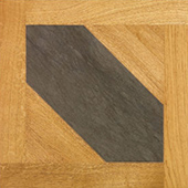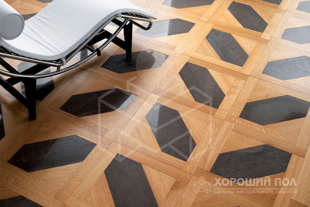 Конструкция: Модульный паркет из натурального дуба с инкрустацией полированного мрамора. Соединение модулей между собой осуществляется при помощи планок шириной 2см. Ценный слой древесины — 1,1см. Подложка из многослойной березы толщиной — 1см. Поверхность покрыта лаком UV — ультрафиолет.